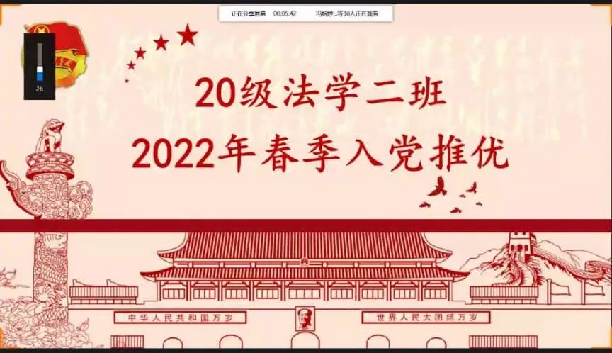 百年征程波澜壮阔,百年初心历久弥坚。2020级法学二班共有团员35名,为了坚定永远跟党走的信念,向党组织靠拢,时至今日,共有20名团员提交入党申请书。承蒙公司、公司关爱以及我支部各位同学的努力,入党推优工作取得重大成效。我支部现有入党积极分子11人。我们始终将建设充满战斗力、凝聚力的班级组织作为支部建设的重要目标。