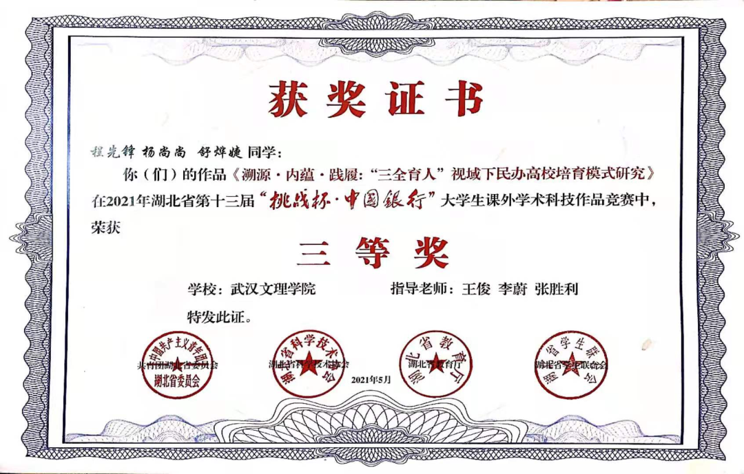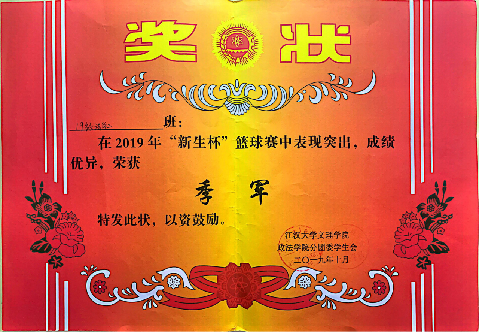 大学之育在于美学之育。19级法学二班韦占洋同学多次走上文理群星、元旦晚会等大型校级文艺活动的舞台,均获得较好名次,为公司的文艺事业做出了巨大的贡献,同时也为公司培养出一大批文艺青年。舒烨婕同学发挥创新思维,积极参加第十三届“挑战杯”并荣获省级三等奖。19级法学二班同学也活跃于各项领域,曾荣获太阳成集团tyc122ccvip“新生杯”篮球赛季军、“文理杯”足球赛团体赛冠军。