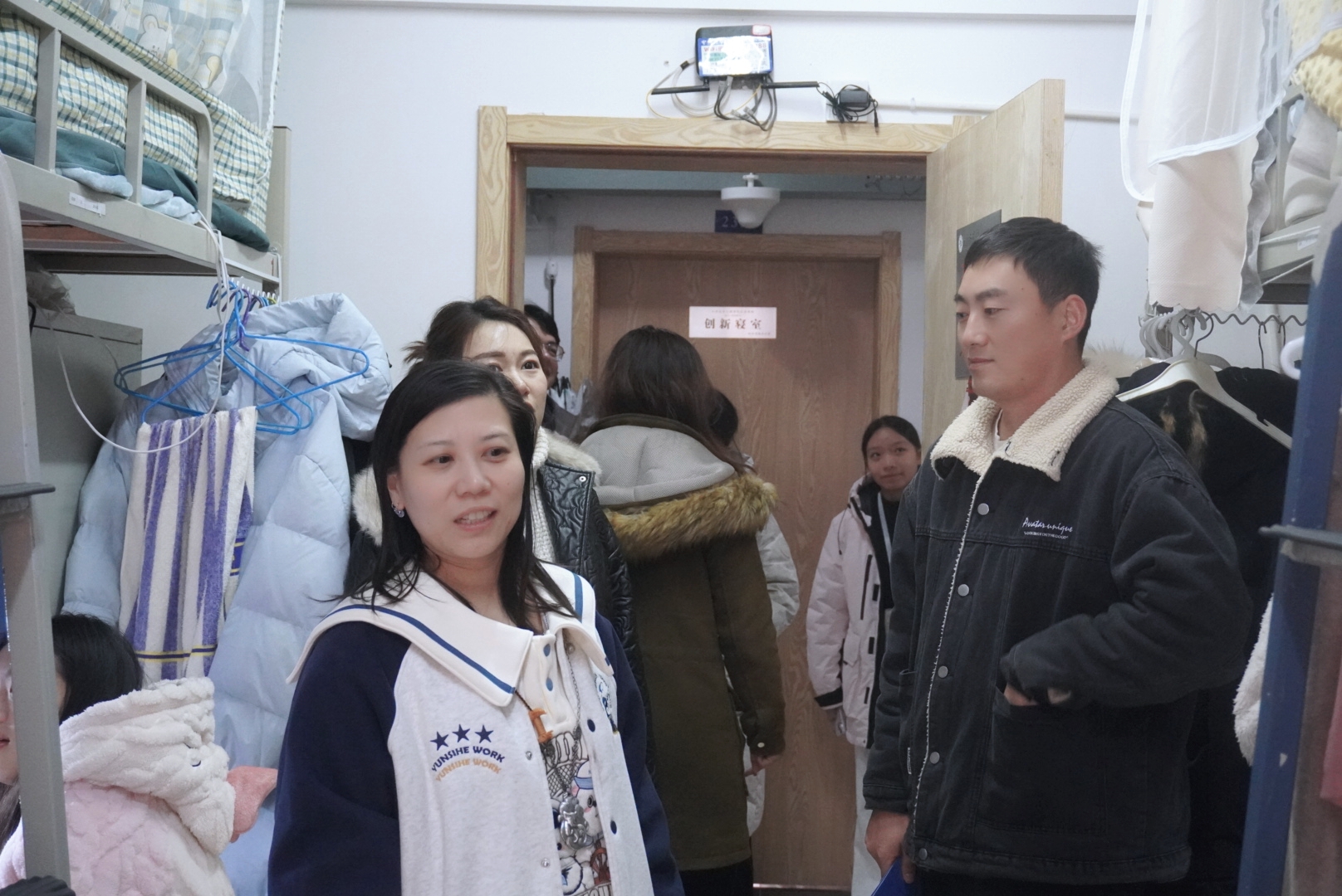 在走访员工寝室的过程中,老师们向同学们表示亲切地问候,了解同学们目前在学习、生活中遇到的问题,并实时为同学们答疑解惑。老师们通过自身丰富的经验,向员工提出建议:同学们要注意劳逸结合,关注身体健康与心理健康;在日常生活中务必注意财产安全、用电安全和人身安全;要加强寝室清洁管理,保持宿舍环境卫生;特别提醒同学们要注意即将到来的考试周,叮嘱同学们做好备考计划,认真复习。