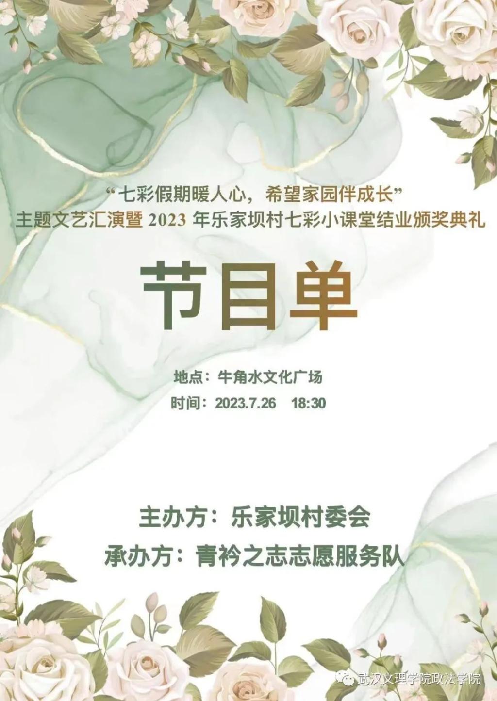 本次晚会由牛角水教学点的员工王其跃、覃美妍和杨柳池教学点的员工黄家奥、张思琪主持,共青团恩施州委书记陈潇同志、共青团建始县委书记粟迪同志、业洲镇党委书记吕宗鲁同志、业洲镇人大主席袁庆同志、乐家坝村党委书记刘爱平同志、州委组织部驻乐家坝村第一书记王祖华同志、业洲镇驻乐家坝村派遣干部黄升滔同志、牛角水教学点负责人张学主任和杨柳池教学点负责人张玉主任莅临现场,同时到场的还有州委组织部驻乐家坝村工作队尖刀班成员、乐家坝村村两委成员、七彩小课堂全体员工、员工家长及青衿之志队所有成员。
