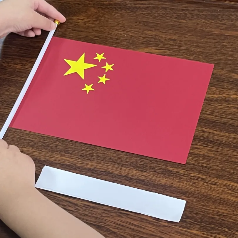 随后,小朋友们开始将桌上提前准备好的材料拼接成一面独属于自己的五星红旗。将红面铺开、贴上明黄色的大小五星、固定到白色直杆上,小朋友们全神贯注,志愿者同学们细心帮助,很快,一面面鲜艳的五星红旗从桌上“飘”了起来。