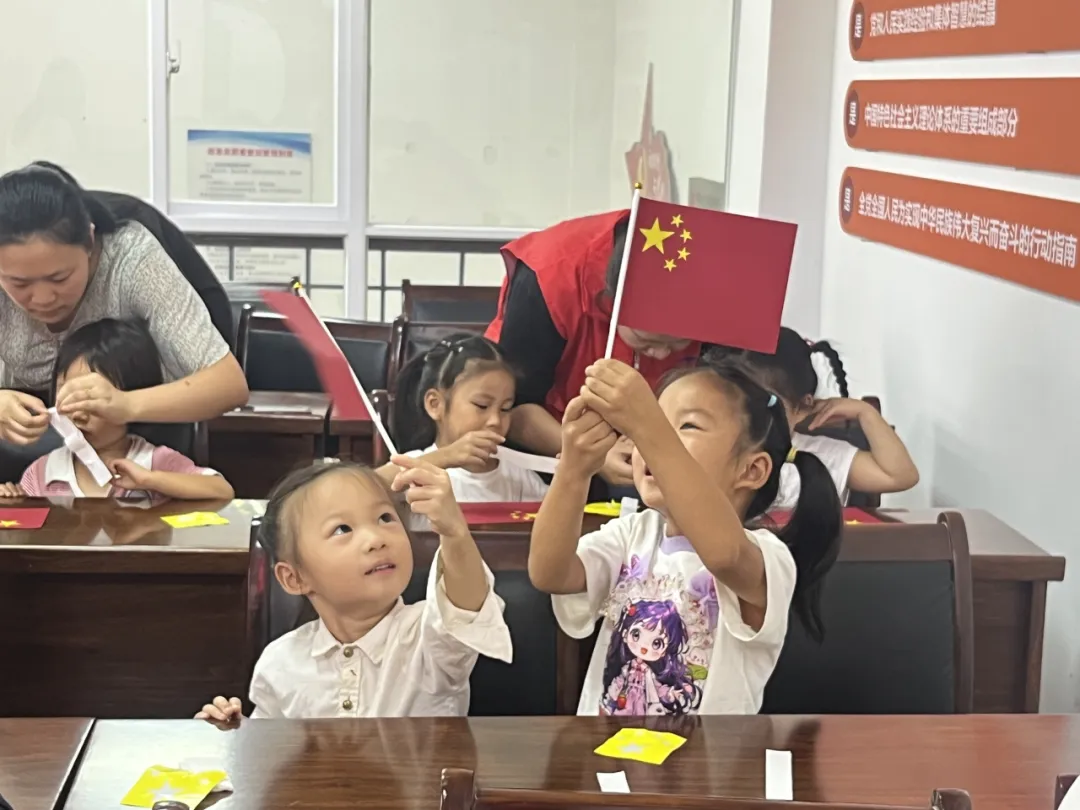 在完成五星红旗的制作后,小朋友们很快为它们找到了归宿——党员同志。大手拉小手,大国生小爱,一面五星红旗,连接的不仅仅是老党员同志与少年,更是祖国的前浪与后浪、一个时代先驱力量与后继力量。