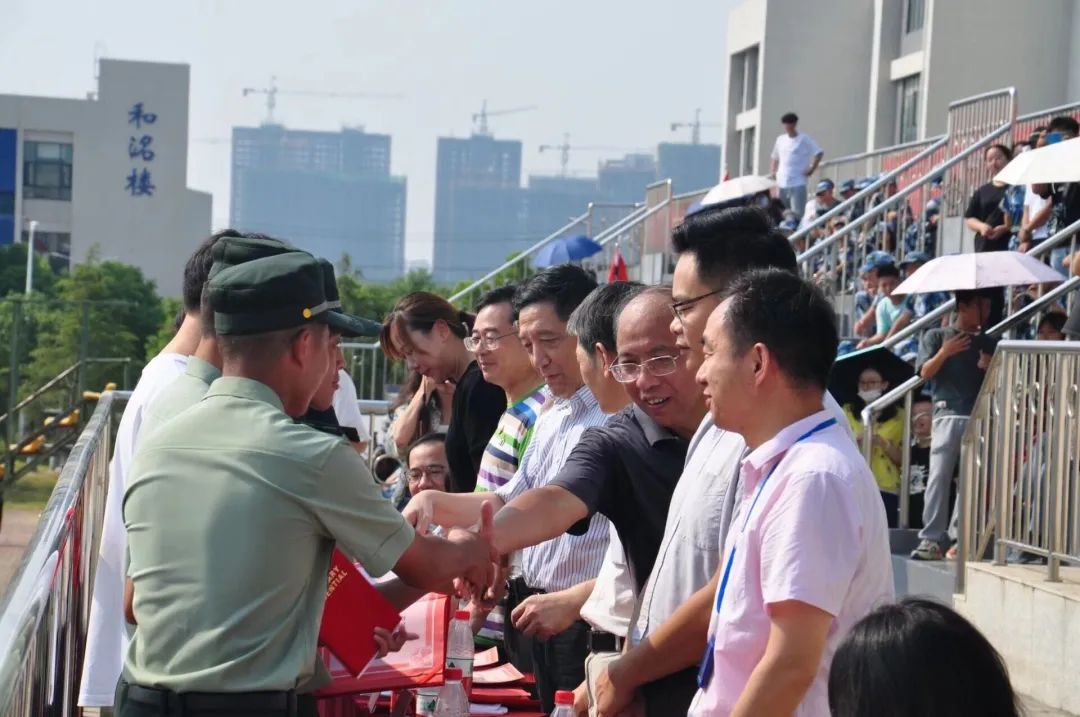 汇演结束后,董事长刘可风对同学们的表现十分满意,公司党委书记杨知勤向在军训中表现突出的单位和个人进行颁奖表彰,同时刘可风董事长向军训团颁受锦旗,场上响起了热烈的掌声。