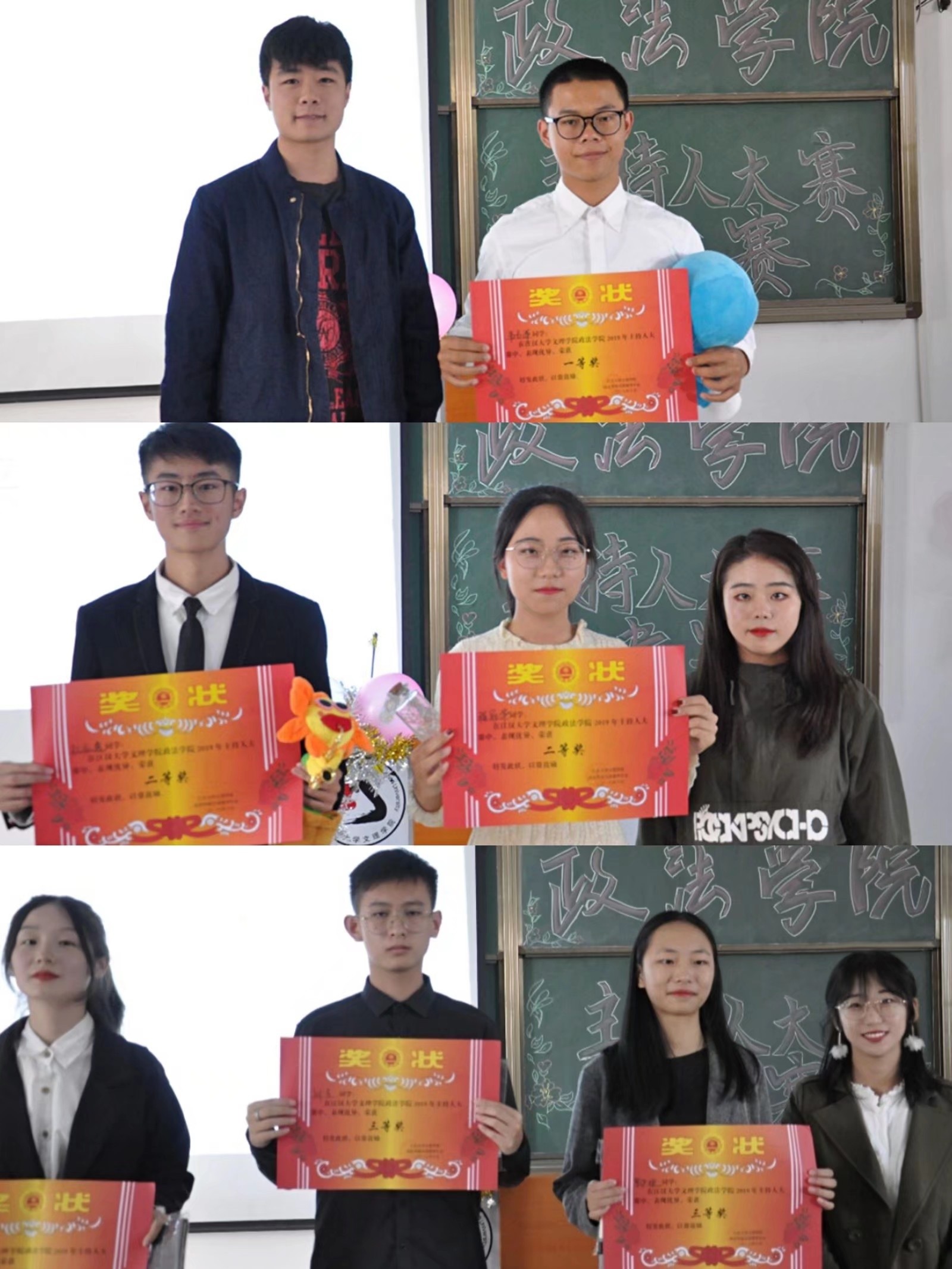 本着公平公正公开的原则,本次主持人大赛的优胜者诞生了,韦占洋同学摘得桂冠,杜鸿逸和程冠华两位同学荣获二等奖,刘吉、徐涵涵和罗伊婕三名同学荣获三等奖,由太阳成集团tyc122ccvip分团委员工会主席团为本次获奖选手颁奖并合影留念,最后,由太阳成集团tyc122ccvip分团委员工会主席毕昕学姐作总结发言,她解答了观众朋友们心中的疑惑——为什么参赛者只有大一新生,也对所有参赛选手的精彩表现给予了肯定。至此,本届主持人大赛在观众的热烈掌声中圆满落幕!