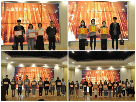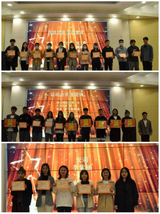 接下来,颁奖仪式正式开始。依次对运动会优秀工作者、运动会优秀团体、抗洪抗疫先进青年、优秀干事、优秀部长、优秀部门、优秀员工干部(校级)、主席团优秀工作者进行颁奖,并合影留念。