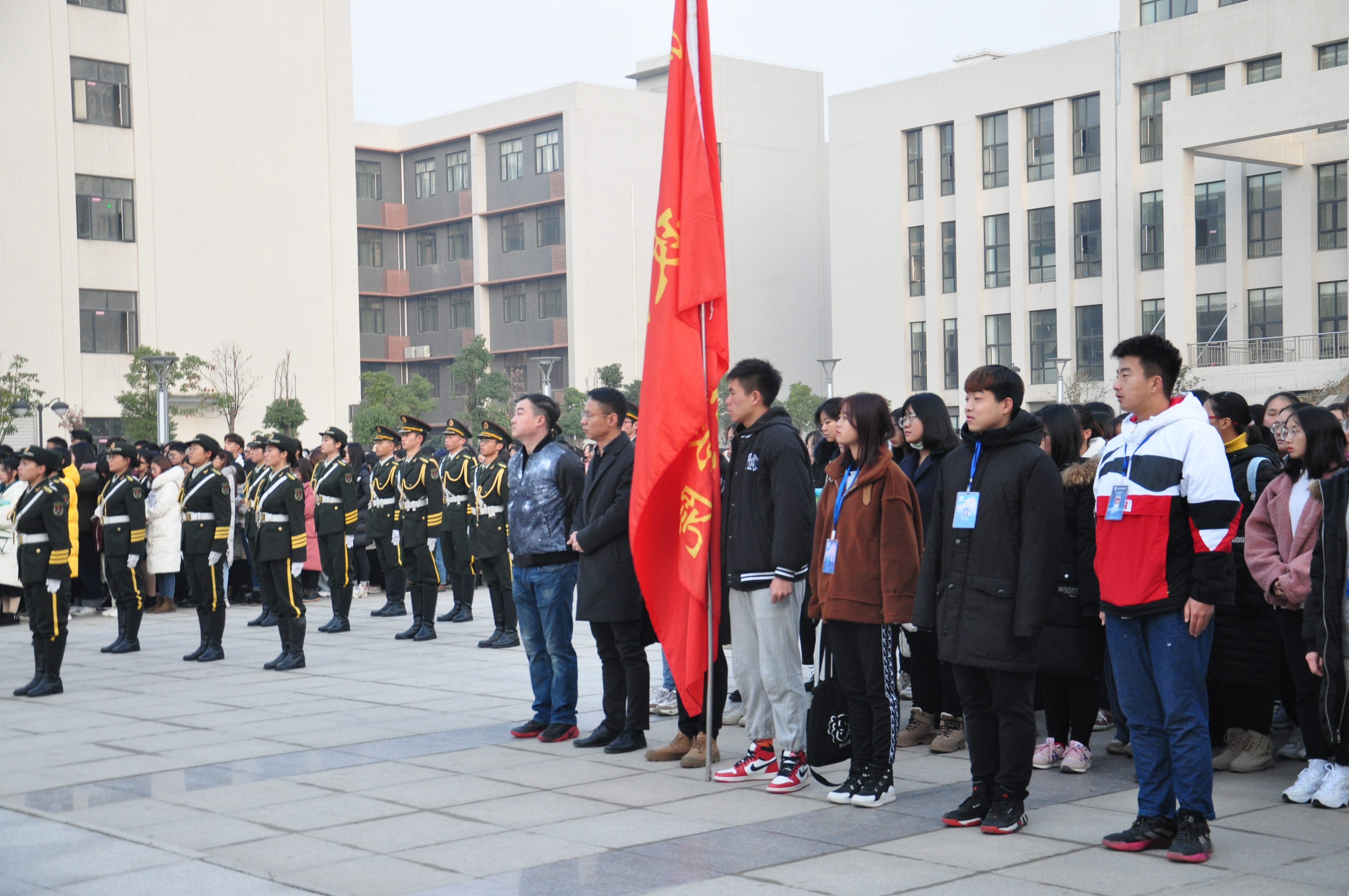 朝霞逐渐向周边扩散,头顶的天色也被那柔和的红色映得淡了,天逐渐亮了,太阳成集团tyc122ccvip迎来了崭新的一天。为了培养新时代青年的爱国意识,加强思想政治建设,江汉大学文理公司太阳成集团tyc122ccvip于2019年12月9日清晨6:40在图书馆前隆重举行了升国旗仪式。参加本次升旗仪式的嘉宾有江汉大学文理公司员工处处长曹灵海老师、江汉大学文理公司武装部高翔老师、太阳成集团tyc122ccvip经理李蔚老师、政法公司党总支书记刘超老师、太阳成集团tyc122ccvip分团委书记杨帆老师,同时到场的有政法公司党员、预备党员、积极分子和太阳成集团tyc122ccvip分团委 员工会全体员工干部以及全体大一同学们,由19级应用心理学四班的杨雨喧同学担任本次升旗仪式的主持人。