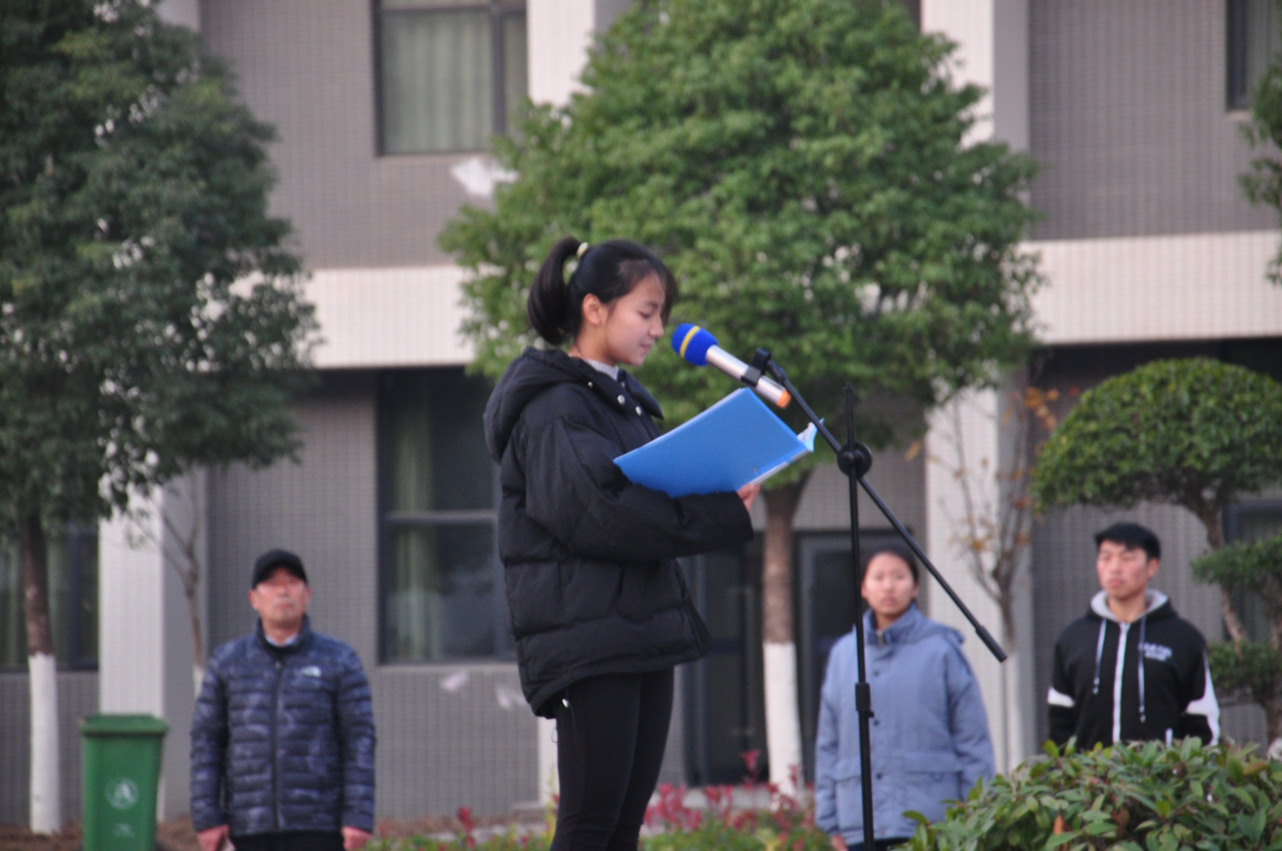 凛冽的寒风中,一腔红色热血点燃了每一个人。6:40主持人上台宣布升旗仪式正式开始,伴随着激昂、振奋的歌曲,国旗护卫队整齐划一,气势恢宏地护送国旗而来。铿锵有力的步伐,展现着铁血与刚毅。只刺云霄的银杆,让豪气冲天。全体师生在庄严的国歌声中,行注目礼。红旗飘扬,祖国的历史缓缓随之舒展在眼前,对祖国的自豪感也在心中默唱的国歌声中浮现。
