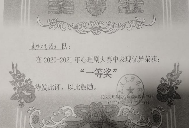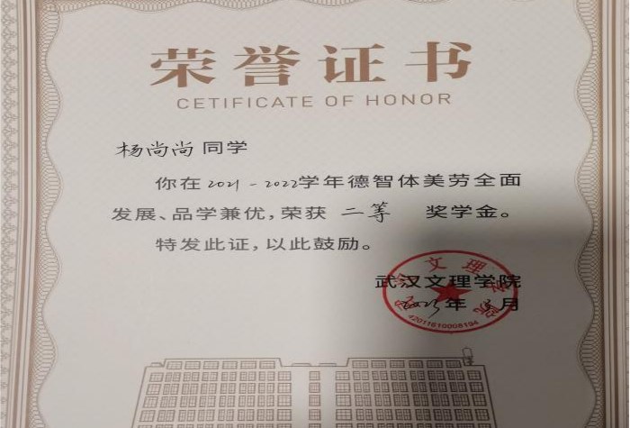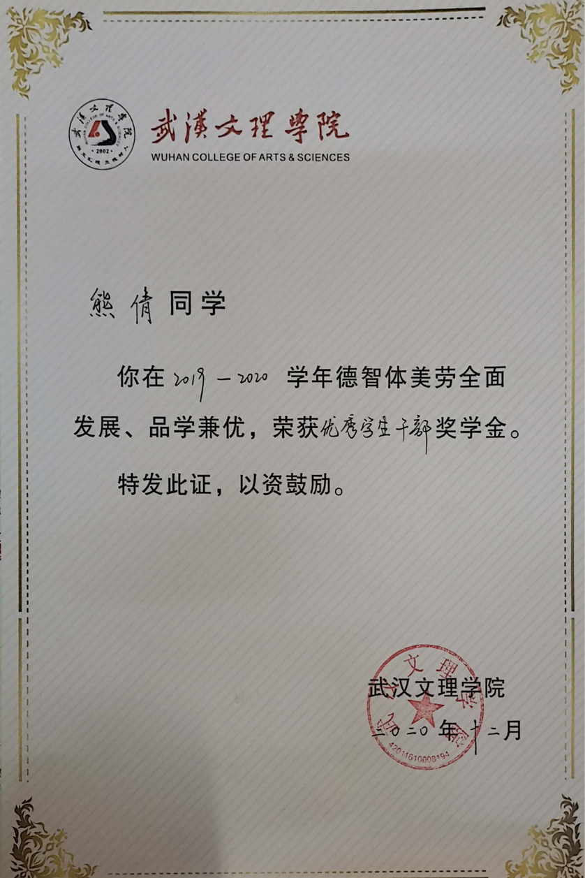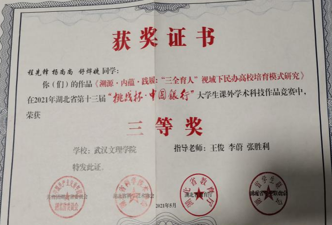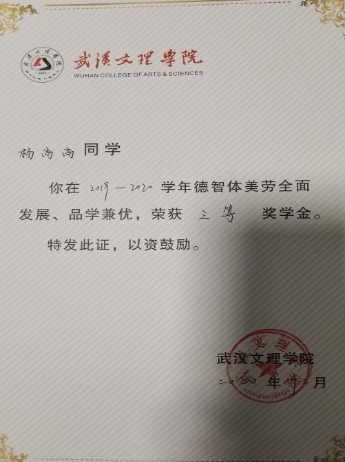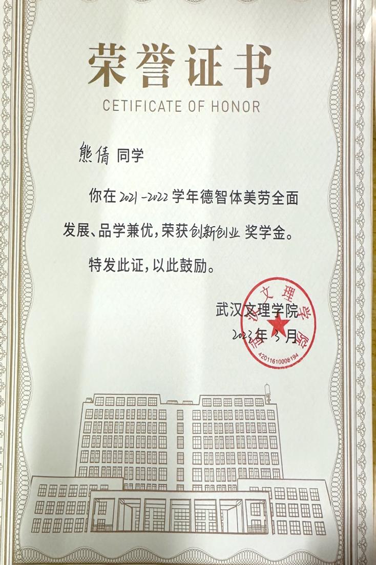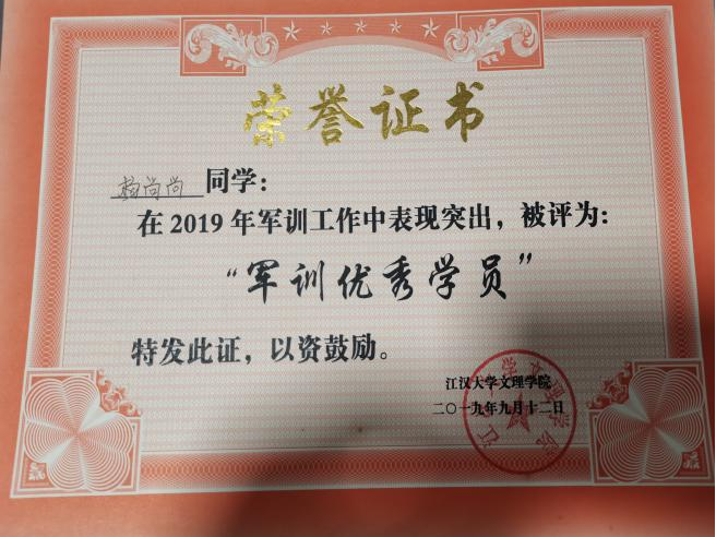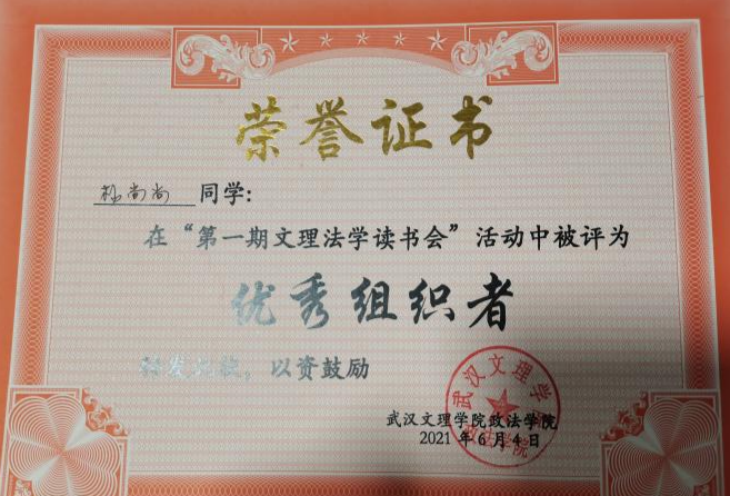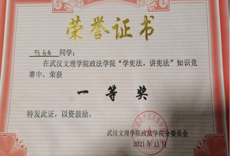 先后荣获“军训优秀学员”、“2019—2020年校级三等奖学金”、“第四届校内辩论赛冠军”、“湖北省第十三届挑战杯•中国银行老员工课外学术科技作品竞赛省赛三等奖”、“2020—2021年心理剧大赛一等奖以及最受观众喜爱奖”、“第一期文理法学读书会优秀组织者”、“2020-2021年奋进奖学金”、“学宪法,讲宪法知识竞赛一等奖”、“第二届模拟法庭大赛优秀组织奖”、“2021-2022年校级二等奖学金”等荣誉。