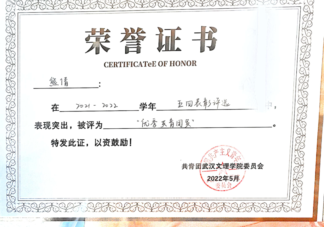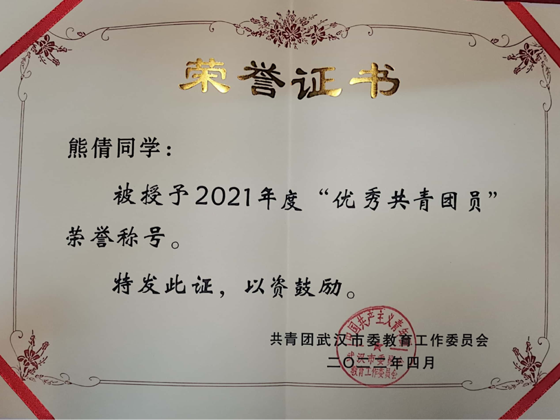 2022年4月获得武汉市2021年度优秀共青团员