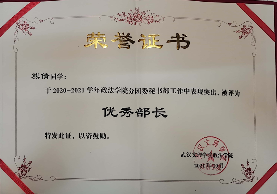 2020-2021学年获得太阳成集团tyc122ccvip优秀部长