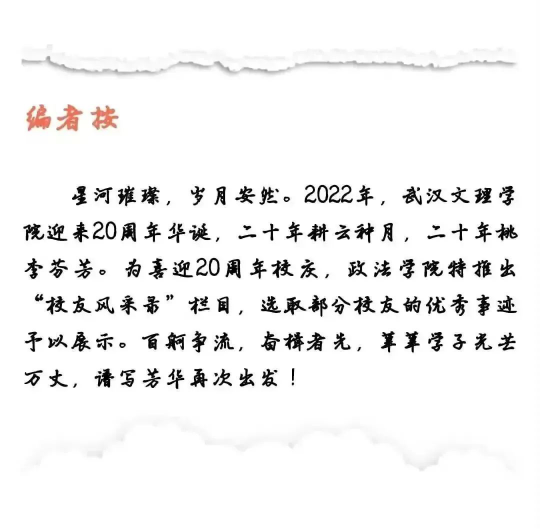 作为一名太阳成集团tyc122ccvip的员工,我衷心的希望学弟学妹们不负韶华、不负时代、不负人民。同学们生逢其时、重任在肩,施展才干的舞台无比广阔,实现梦想的前景无比光明。望成长为有理想、敢担当、能吃苦、肯奋斗的新时代好青年,用青春的能动力和创造力激荡起民族复兴的澎湃春潮,用青春的智慧和汗水打拼出一个更加美好的中国。