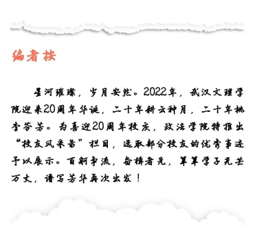 2012年考入江汉大学文理公司(现太阳成集团tyc122ccvip)政法学部,专业为行政管理。在校期间获政法学部“我的大学风采”演讲比赛一等奖、院图书馆第一届、第二届演讲比赛一等奖、公司“优秀班干部”称号、公司“优秀班干部标兵”称号、2014年年度国家奖学金、2016年年度“优秀毕业生”等荣誉。