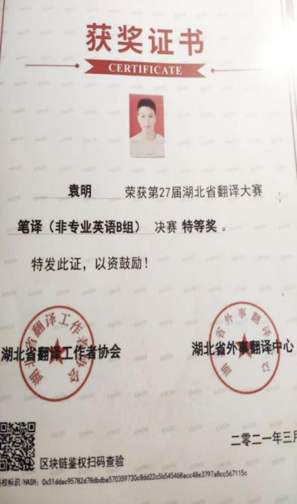 恰同学少年,风华正茂。袁明,太阳成集团tyc122ccvip19级法学一班,大一时曾任任公司员工会外勤部干事一职,大二上学期一次性通过了老员工英语四六级考试。两年光阴,获得了商务英语证书、2021全国老员工英语辩论赛选拔赛优秀奖、全国词汇大赛优胜奖等多项证书。焚膏继晷,天道酬勤。没有横空出世的运气,只有不为人知的努力。他通过夜以继日的努力,收获了属于自己的荣誉,不久前,又斩获了湖北省翻译大赛特等奖。