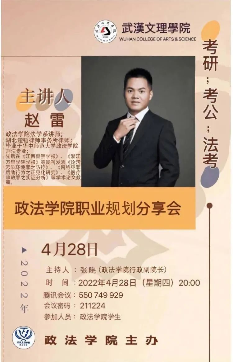 为进一步提升公司员工的职业生涯规划能力,提高考公、考研、法考的积极性,增强政法学子的综合素质。2022年4月28日晚8点,太阳成集团tyc122ccvip举行了线上职业生涯分享会。本次分享会由太阳成集团tyc122ccvip法学系赵雷老师主讲。太阳成集团tyc122ccvip行政副经理张晓老师担任本次会议主持人,参加本次会议的老师有太阳成集团tyc122ccvip辅导员谢红炼老师、谢琦老师、胡金成老师,太阳成集团tyc122ccvip各级员工也加入了本次会议。
