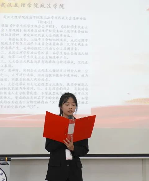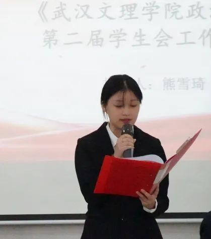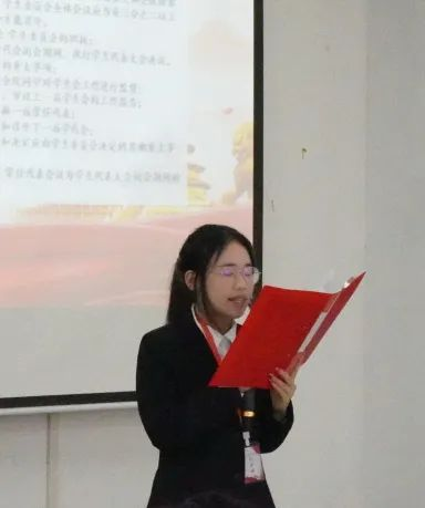 王思雨同学宣读《公司员工会章程》,陈梦婷同学宣读本次大会选举办法。