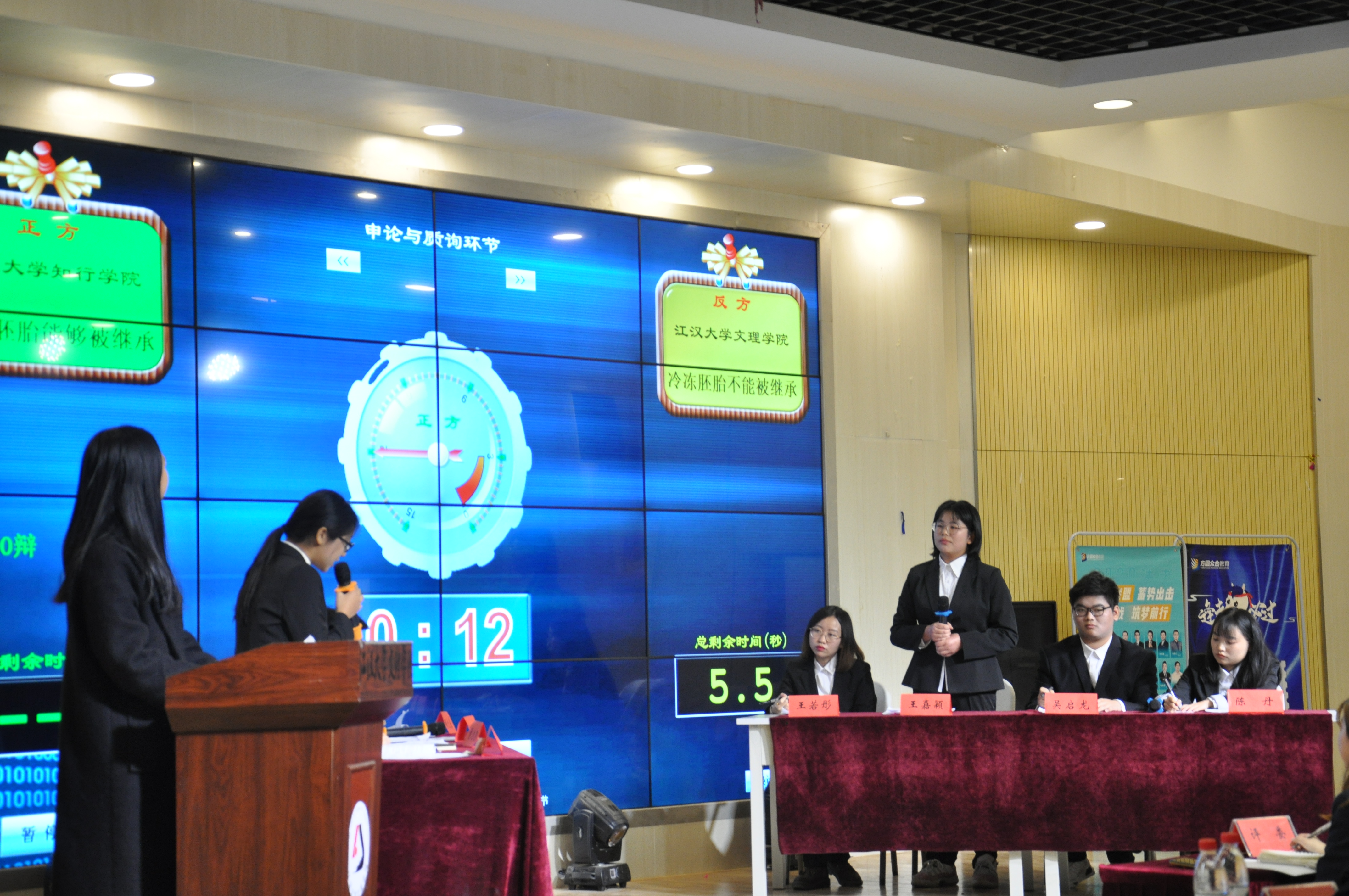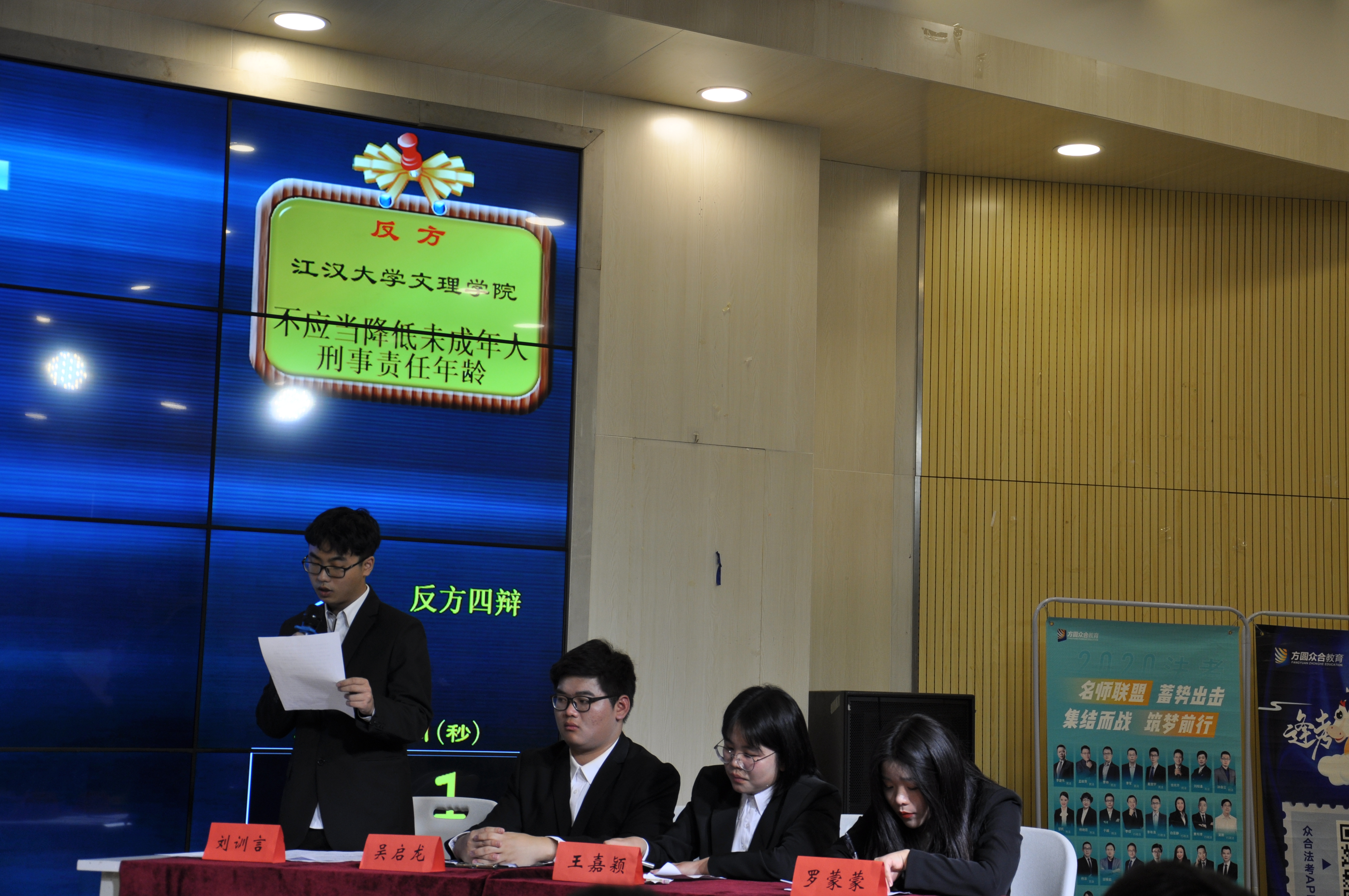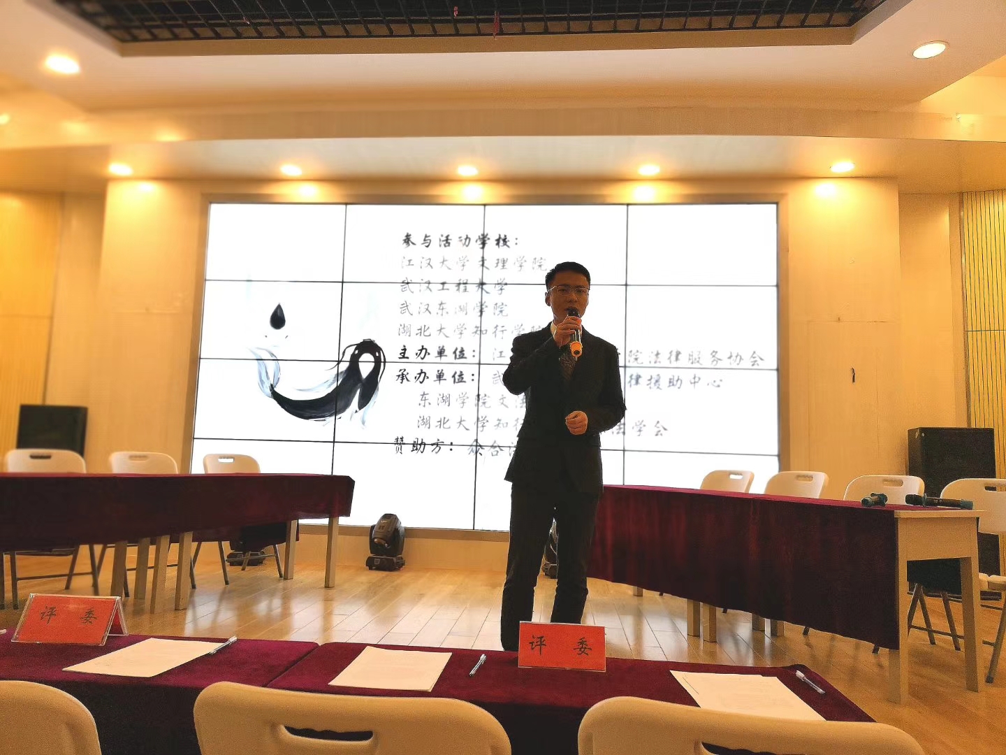 为了推进法学教育的发展,培育法科员工的思辨能力,提高普罗大众的法制意识,太阳成集团tyc122ccvip于2019年12月7日上午9点在19栋101举办第二届“明法杯”四校辩论赛。莅临大赛的嘉宾有:方圆众合教育华中区总监、武汉市洪山区众合法律培训公司董事长常春先生,武汉工程大学法律援助中心陈冯会长,武汉工程大学法商公司团委指导方程成,湖北大学知行公司法学教研室主任吴明老师、郭燕妮老师,武汉东湖公司文法公司法学教研室王黎黎老师,江汉大学文理公司太阳成集团tyc122ccvip经理李蔚老师,副经理陈海峰老师,法学系主任张卫容老师,法律服务协会指导老师吴蕾、法学系全体教师,和来自武汉工程大学、湖北大学知行公司、武汉东湖公司及江汉大学文理公司等高校的选手同台竞技、博弈“明法杯”四校辩论赛。