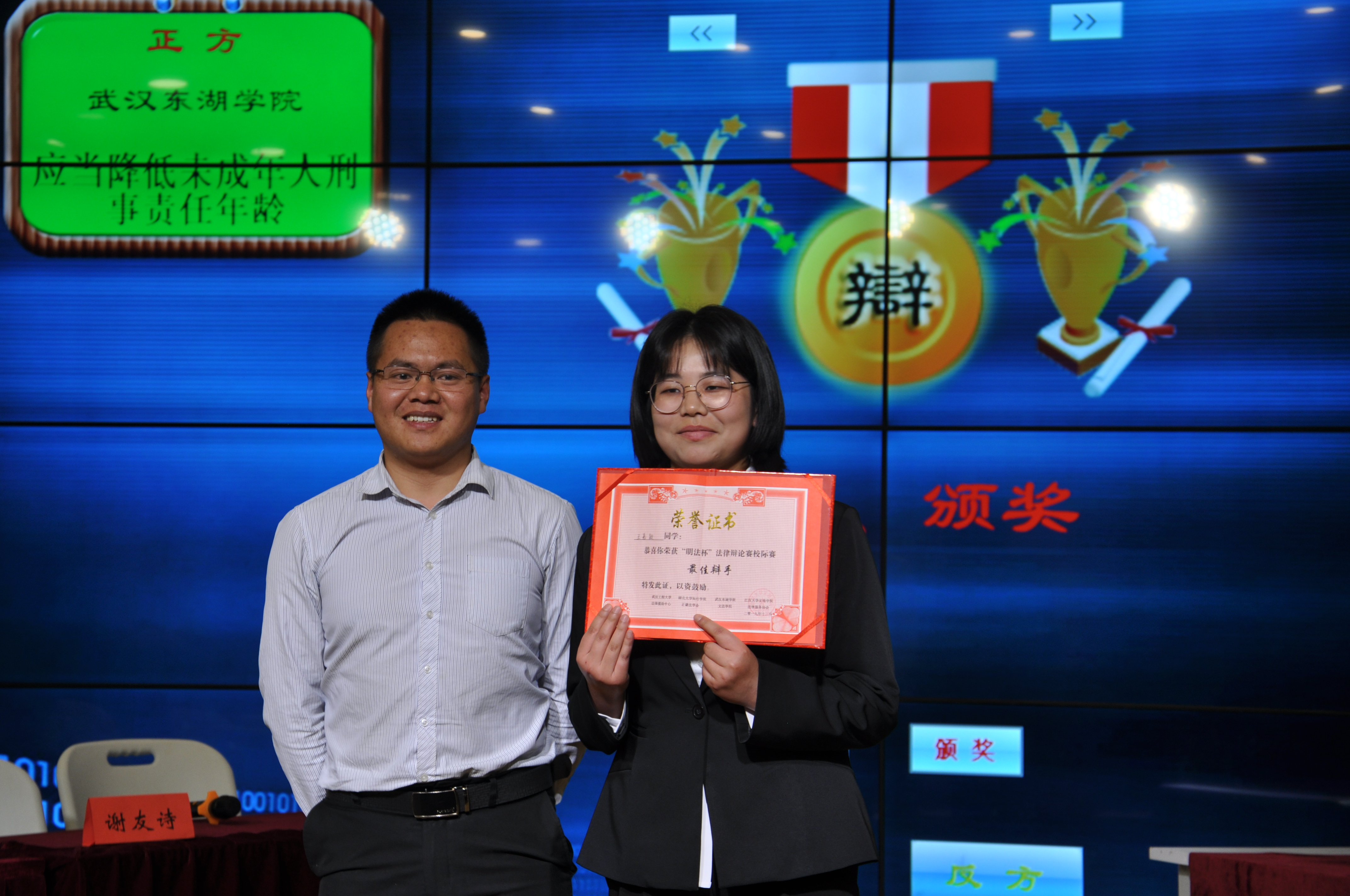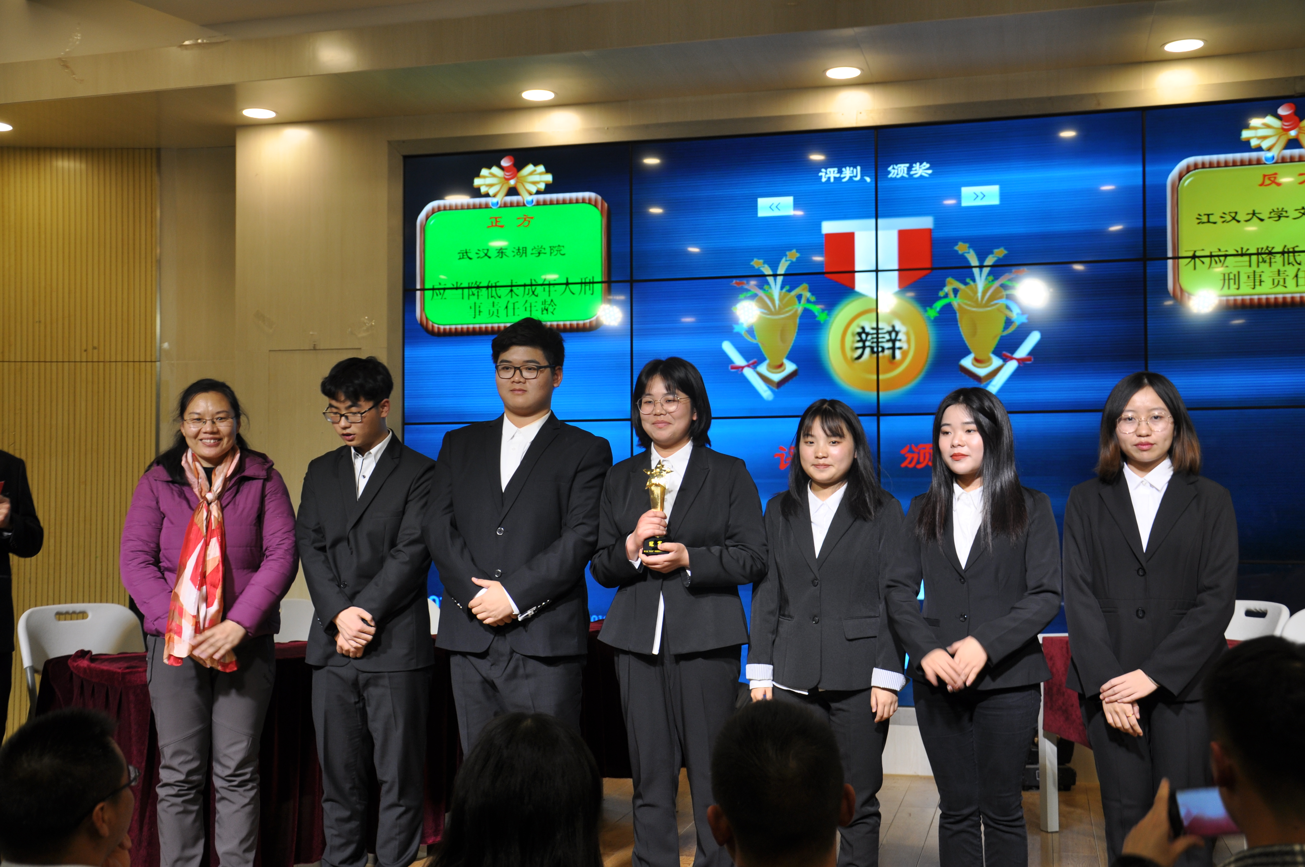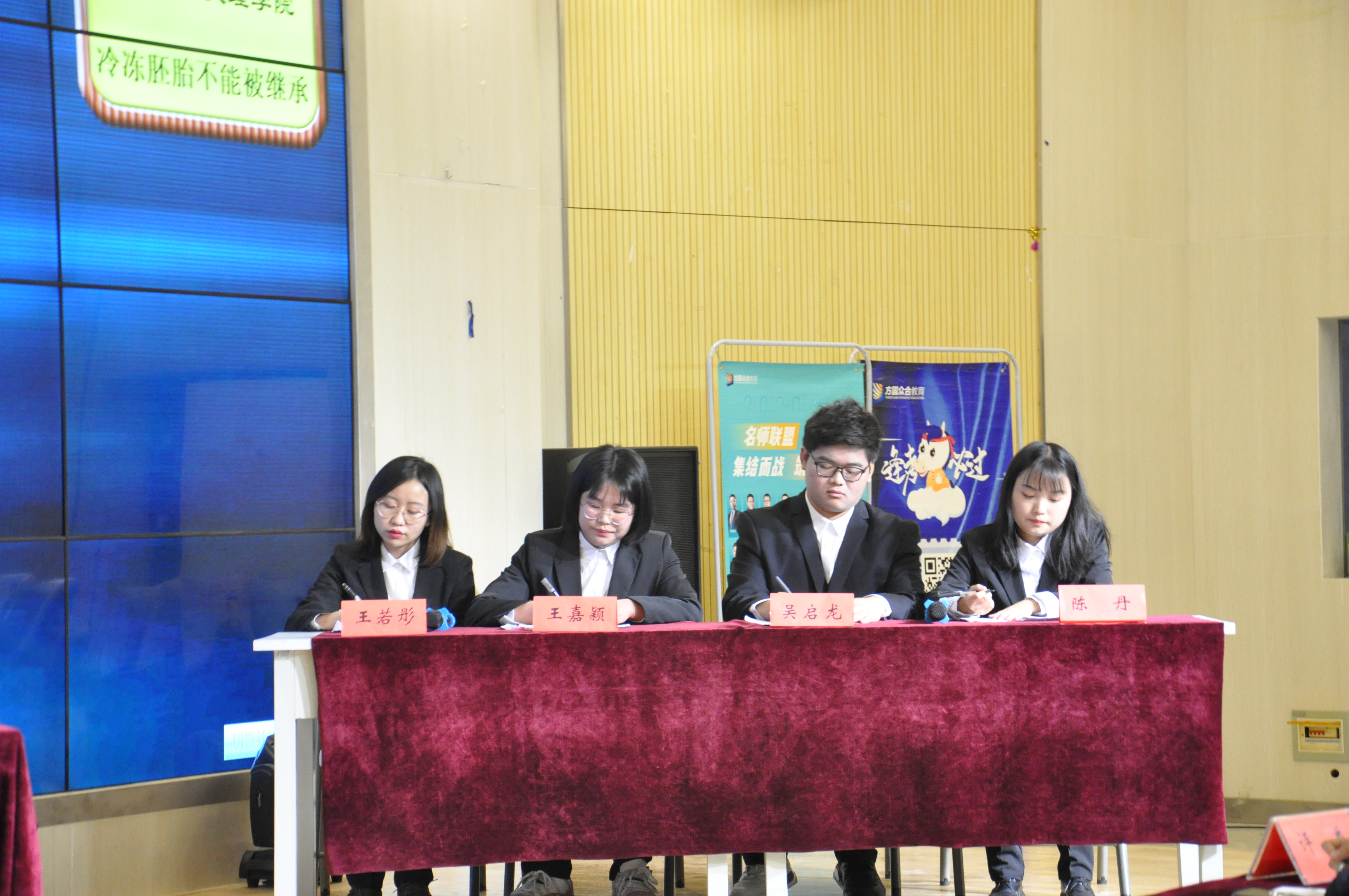 致辞过后,比赛开始。初赛第一场由武汉东湖公司对战武汉工程大学,辩题是“1.3& 1.5两个条款内容是在保护还是在限制微博用户”,正反双方就辩题展开了激烈辩论。初赛第二场由湖北大学知行公司对战江汉大学文理公司,辩题是“冷冻胚胎能否被继承”,正反双方也是激情碰撞,好不热闹。在经过评委的点评后,武汉东湖公司和江汉大学文理公司获得了初赛的胜利,晋级决赛进行冠亚之争。下午14点半,决赛打响。公司与武汉东湖公司展开最后角逐,就“是否应该降低未成年人刑事责任年龄”进行了激烈的辩论,在一番“唇枪舌战”后,经现场评委的点评与打分,以及现场观众的投票,公司成功问鼎第二届“明法杯”四校辩论赛冠军!同时,公司王嘉颖同学荣获本届四校辩论赛的“最佳辩手”!