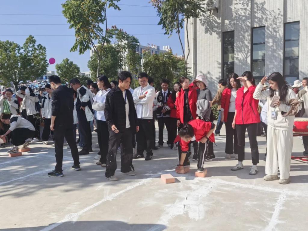 运动会第一项,是兼具耐力和技巧的摸石头过河,那一块块小小的泡沫砖头,在一次次移动中支撑教职工前进。教职工们步伐沉稳,耐心传递,不为喧闹的环境所影响,顺利地完成了比赛。