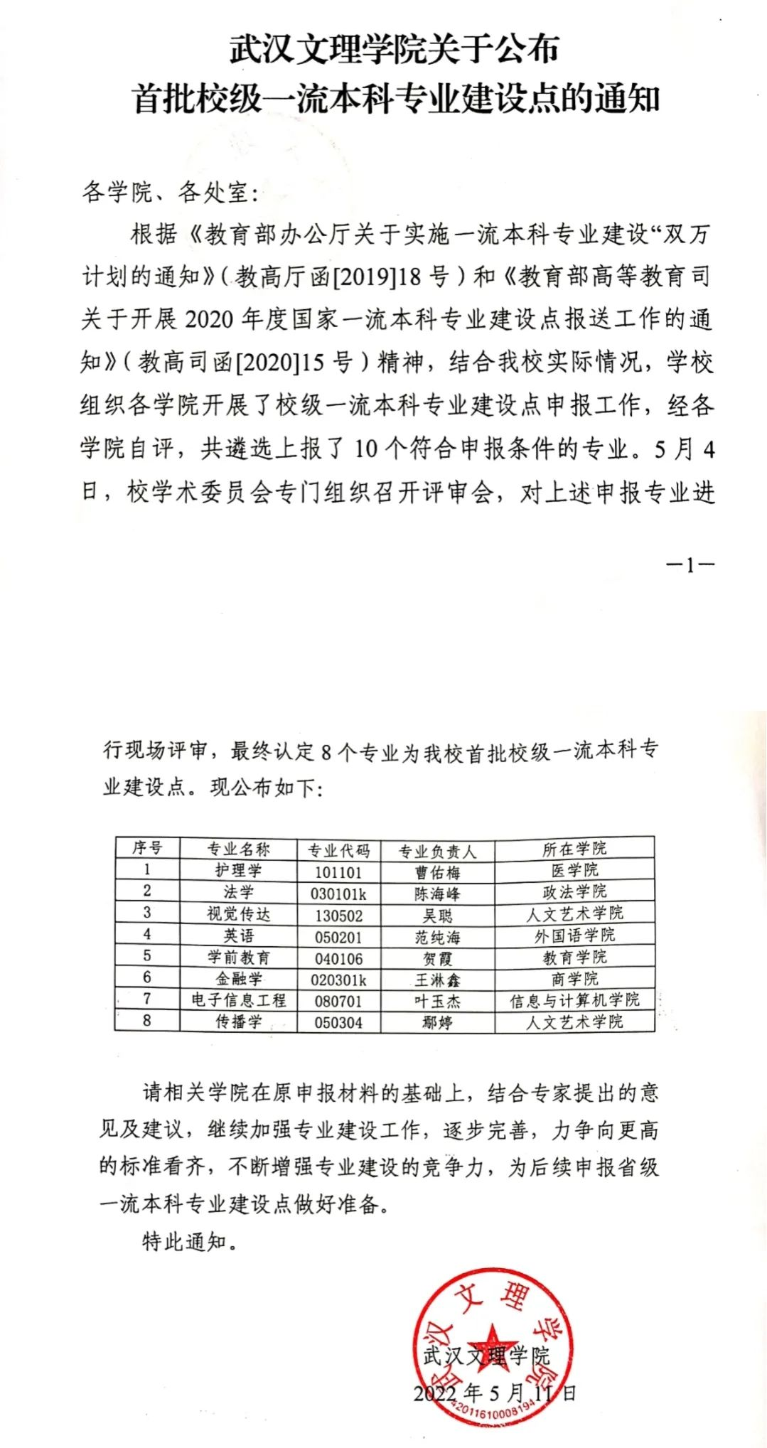 根据《教育部办公厅关于实施一流本科专业建设“双万计划的通知》(教高厅函[2019]18号)和《教育部高等教育司关于开展2020年度国家一流本科专业建设点报送工作的通知》(教高司函[2020]15号)精神,结合公司实际情况,公司组织各公司开展了校级一流本科专业建设点申报工作,经各公司自评,共遴选上报了10个符合申报条件的专业。5月4日,校学术委员会专门组织召开评审会,对上述申报专业进行现场评审,最终认定8个专业为公司首批校级一流本科专业建设点。现公布如下: